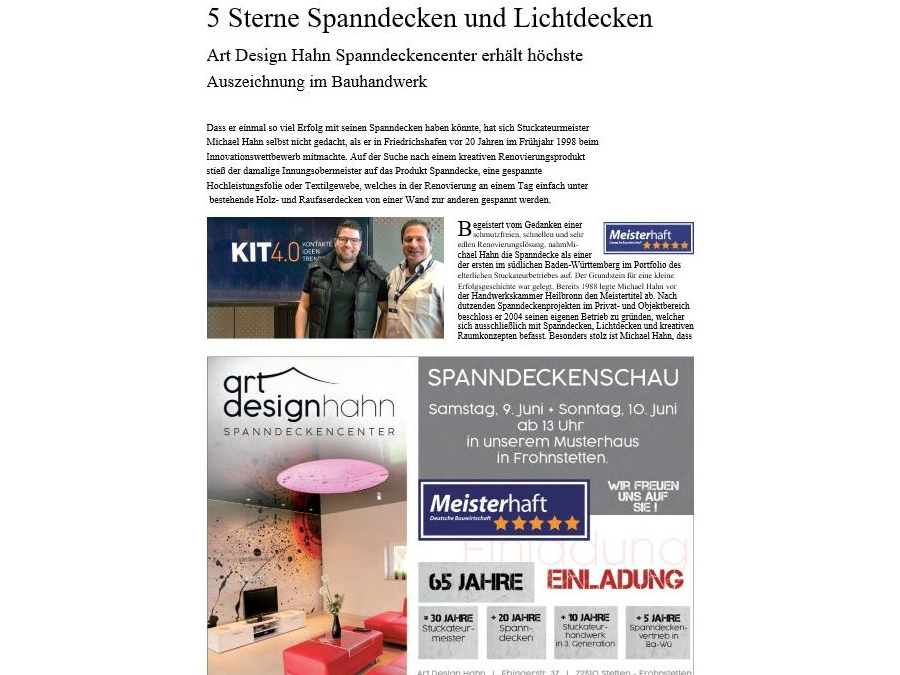 Dass er einmal so viel Erfolg mit seinen Spanndecken haben könnte, hat sich Stuckateurmeister Michael Hahn selbst nicht gedacht, als er in Friedrichshafen vor 20 Jahren im Frühjahr 1998 beim Innovationswettbewerb mitmachte. Auf der Suche nach einem kreativen Renovierungsproduktstieß der damalige Innungsobermeister auf das Produkt Spanndecke, eine gespannte Hochleistungsfolie oder Textilgewebe, welches in der Renovierung an einem Tag einfach unterbestehende Holz- und Raufaserdecken von einer Wand zur anderen gespannt werden.