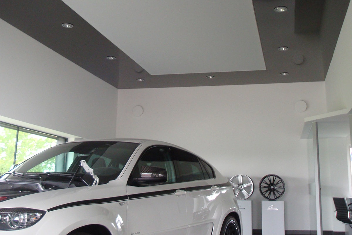 - Gestaltung des Showrooms mit Spanndecken in Matt und Glanz, in Kombination mit Lichtdecken.