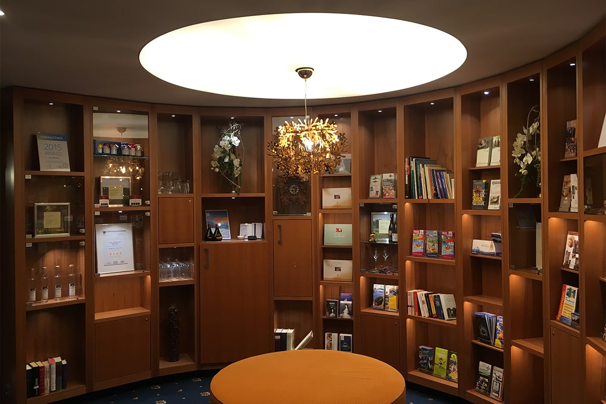 - Lichtkreis mit integrierten Kronleuchter im Rezeptionsbereich.
