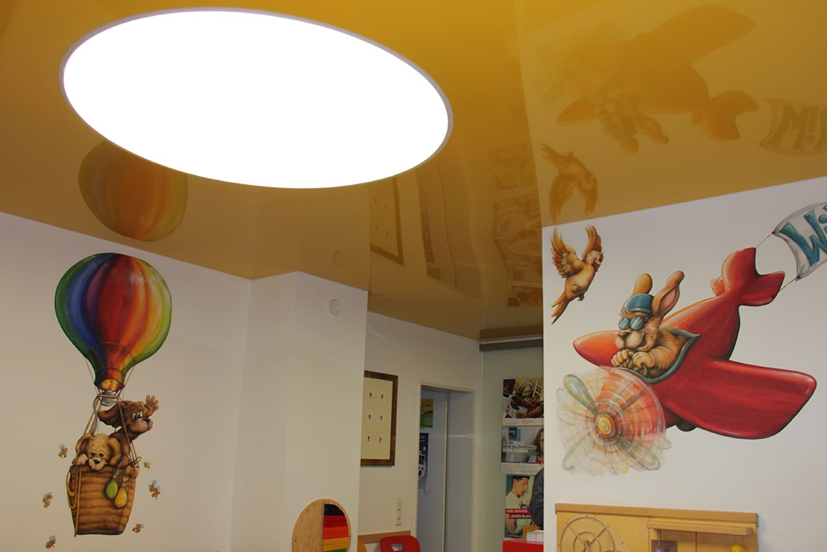 - Einbau von gelben und roten Glanzdecken kombiniert mit Lichtdecken