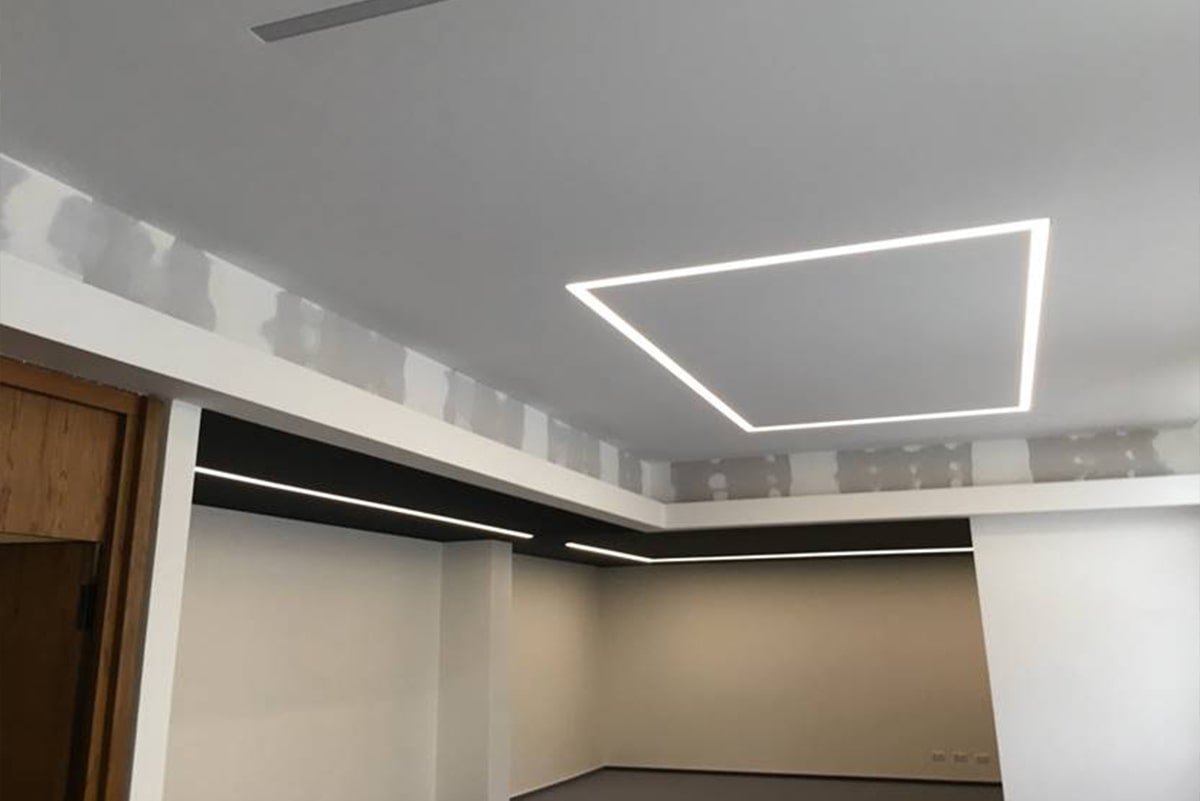 - Einbau von Akustikspanndecken im Aufenthalts- und Kantinenbereich in Kombination mit LED-Lichtleisten.